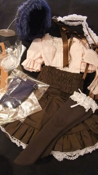入荷のセット内容は、ウィッグ、眼帯、ボンネット、ブラウス、付け襟、コルセット、ペチコート、スカート、手袋、靴下、手錠ホルダーです。