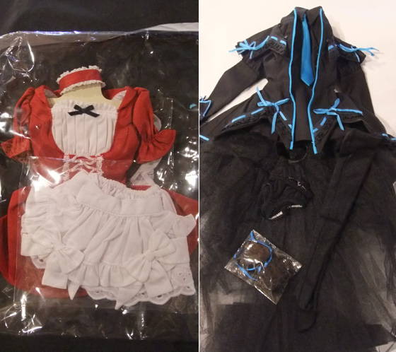 チョーカー、メイドドレス、ショーツ、エプロン、パニエ、カフス、ニーソックス、カチューシャのセットです。