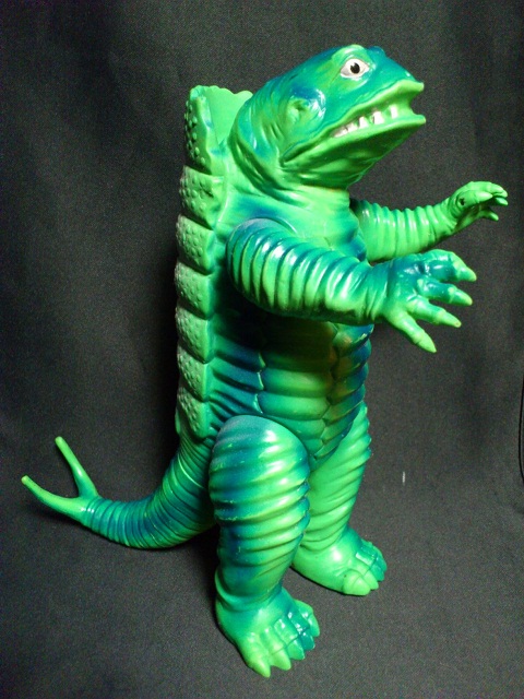 ウルトラマン第21話「噴煙突破せよ」に登場した毒ガス怪獣ケムラー。劇中では四つ足だったケムラーはブルマァクソフビではガマクジラと同様直立での立体化。成型色はグリーンでダークブルーのスプレーが全身に入っています。背中の甲羅は当然開きませんが、きれいな薄いピンクのスプレーで赤いラインがポイントで入っています。黒目があり白目と歯はシルバーの塗装が施されています。全高約21cmで当時の定価は350円。パーツ構成は頭からボディまで1パーツ、両手足と尻尾の全6パーツ構成。ふたまたになっている尻尾の先端部は割れてしまうものもあるので、取り扱いには少々ご注意を。ウルトラマン