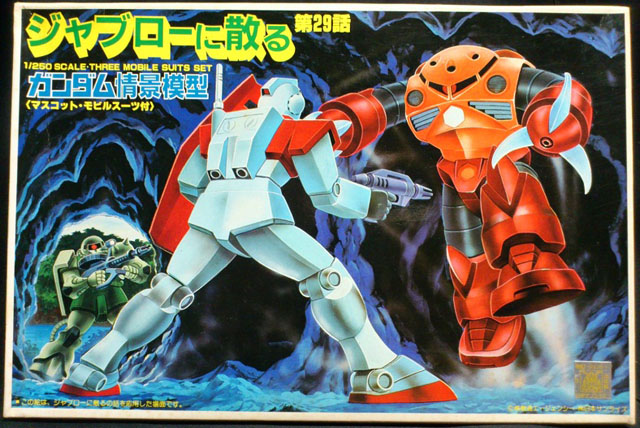 さて、1/250スケールのガンダム情景模型「ジャブローに散る」は専用ベースにバックボード、GMとシャアズゴックと量産型ザクがセットされています。GMはビームスプレーガンを構えシャアズゴックが右腕を前に出しているあたりは「迂闊に近寄るな・・・・」