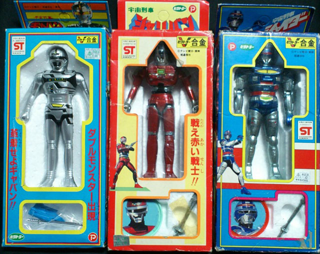 全身ダイキャスト製のビクトラー合金、宇宙刑事ギャバン・シャリバン・シャイダーの3人が揃って入荷。全高はそれぞれ約12cm。全身ダイキャストのため?可動は両肩のみでシャイダーのみが両肩とヒジが可動。合金カテゴリとしては造型、プロポーション、カラーリングどれをとってもバンダイの超合金にはさすがに及ばないですが、重量感だけは負けておらず!!しかし、その重量感ゆえにかヘッダー部分がいたんでいるものが多いです。