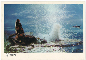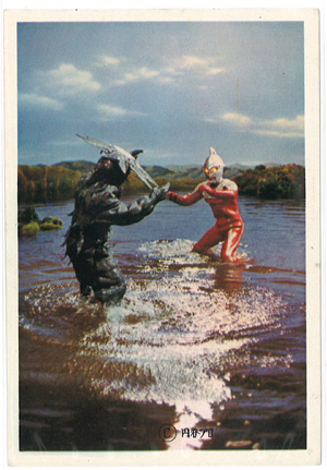ガイロスは激しい水柱が印象的な一枚、ウルトラホークとの激しい戦闘シーンのブロマイドとなります。