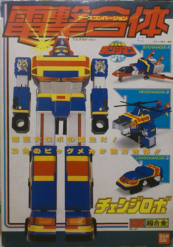 電撃戦隊チェンジマン バンダイ 電撃合体DXチェンジロボ箱いたみ(少破れ・少やけ)、ミサイル各1本、シール剥がれ、本体合体キズ&メッキ少いたみ。こちらもDXバイオロボ同様のオリジナル箱。
