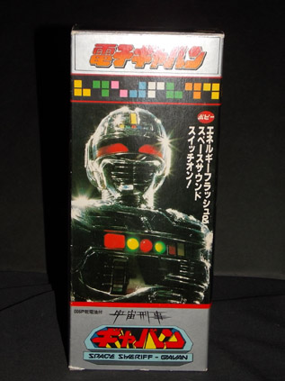 「アップ撮影用のスーツは400万円以上する」など噂が当時の特撮オタクの中で飛び交うほど完成度の非常に高いスーツが印象的でした・・・そんなギャバンを当時のポピーさんは見事に再現!!! しかも電飾装置付き!!!! しかし残念ながらコレは人形単体では電飾ギミックは作動しません・・・専用の電池入り台座にセットすればOK!!! しかもこの台座のネームロゴはなっなんと!!!! ギャバンのネ−ムタイトルを見事に再現・・・ホントセンスイ〜です!
