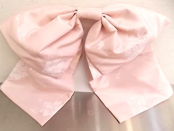薄ピンク色に大きめな花柄がプリントされており、作りリボンの中に芯が入っているので綺麗な形状を保たせることができます。