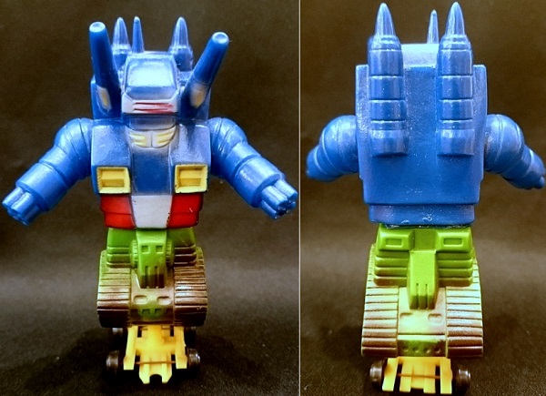 側面から見たときのキャタピラ部分の大きさは変わらないのですが、全高約9cmで5点セットのものよりも大きいガンタンク。上半身と下半身と両腕の4パーツ構成で成型色はダークブルーで下半身のみグリーン。